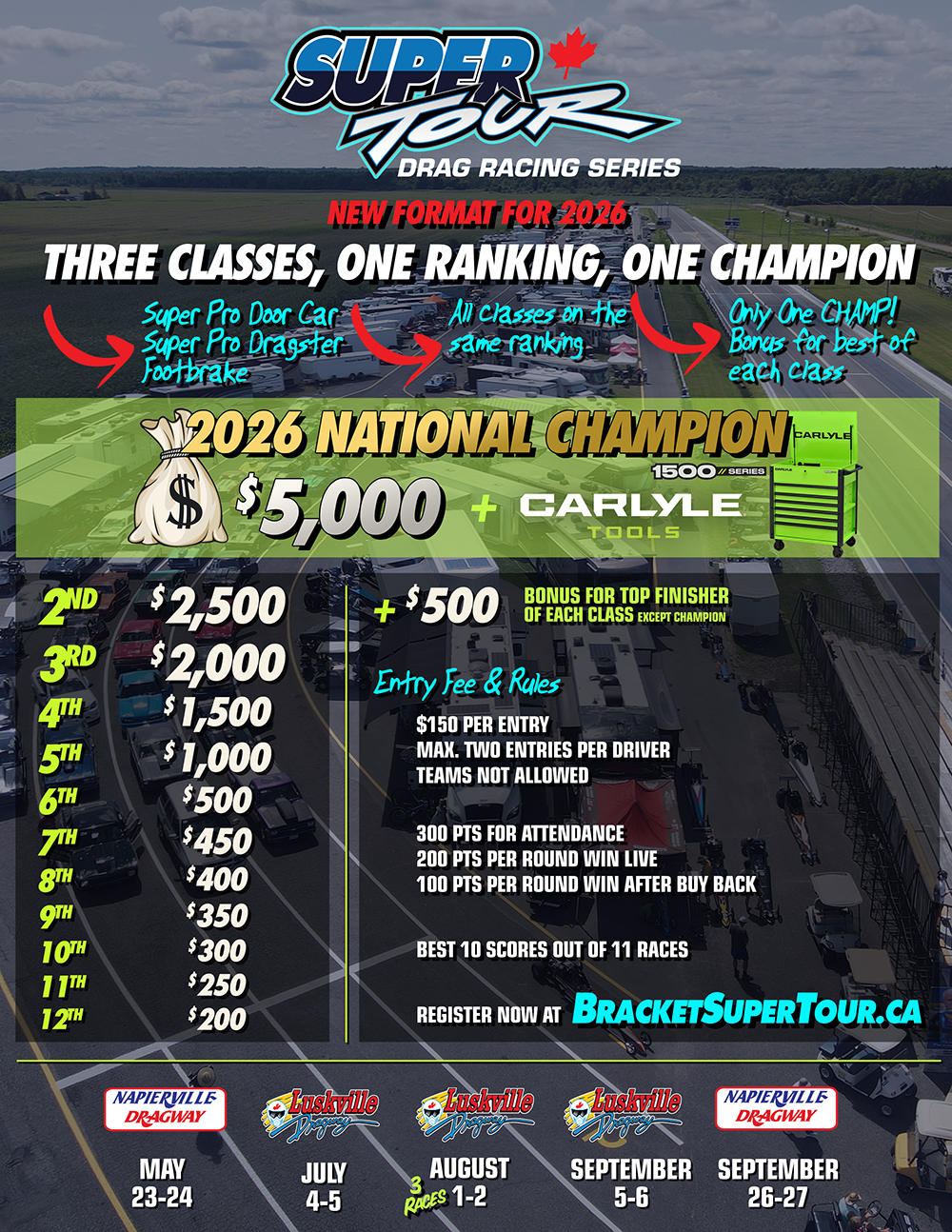 À l’aube de sa 11e saison, la plus grosse série de drag racing au Canada dévoile un tout nouveau format pour le classement du championnat. Cette année, les compétiteurs des trois classes: Super Pro Door Car, Super Pro Dragster et Footbrake, s’affronteront tous sur un seul et même classement général, et UN SEUL pilote sera couronné Champion National 2026.